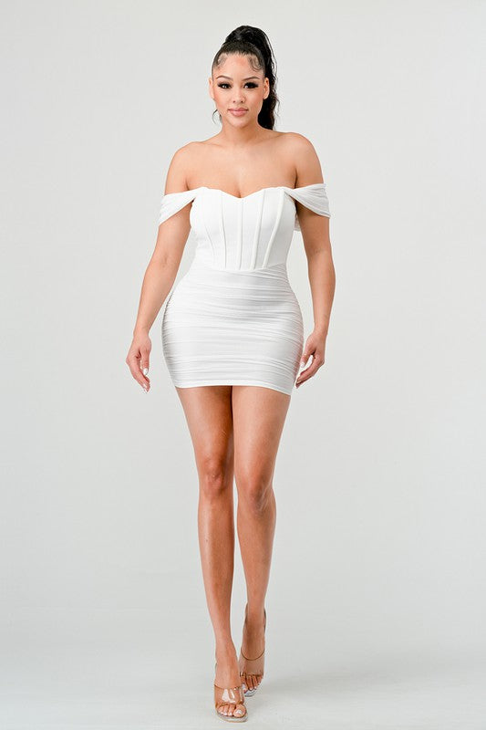 LUXE DRAPED OFF SHOULDER CORSET MINI DRESS