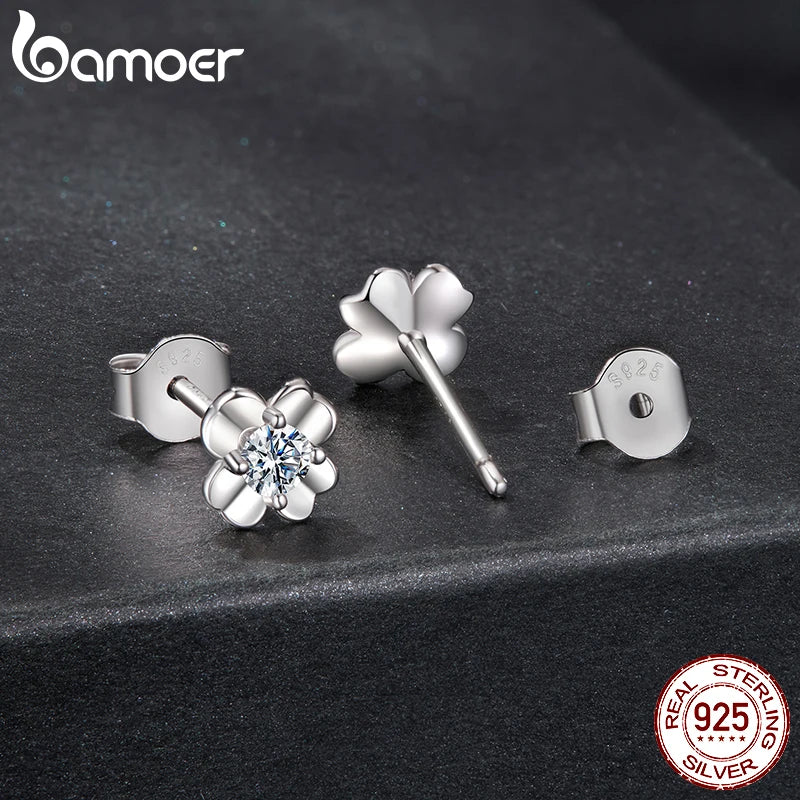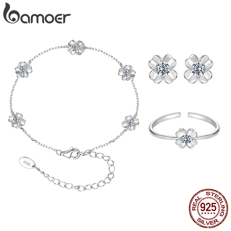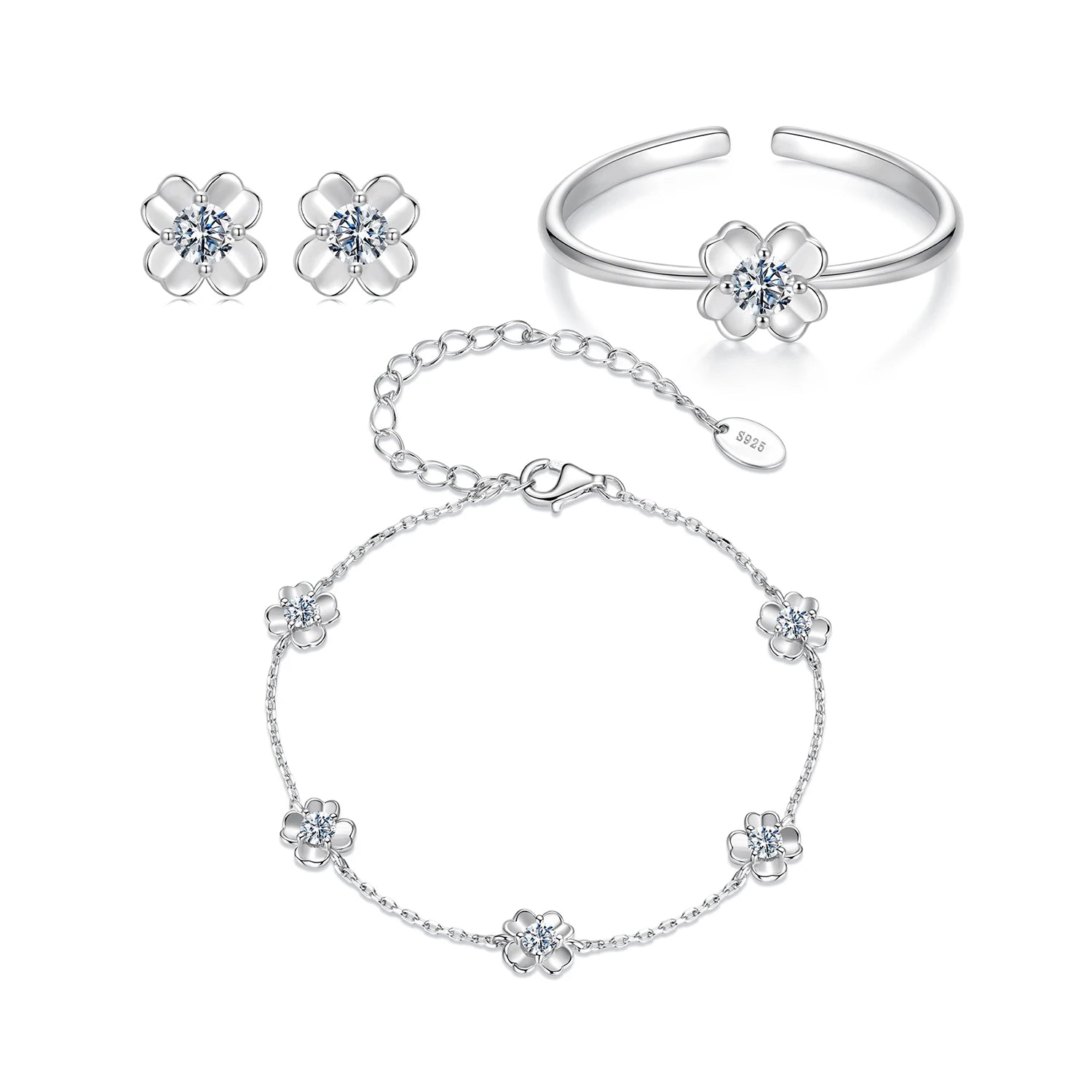 Bamoer Moissanite Jewelry Set Four Leaf Clover Ring Stud Earrings Bracelet 925 Sterling Silver for Wedding Party Jewelry Gift
