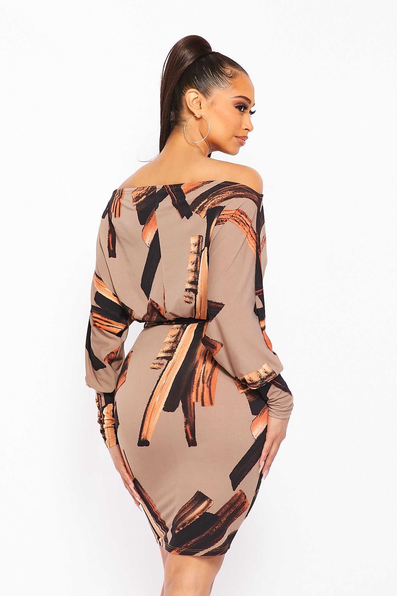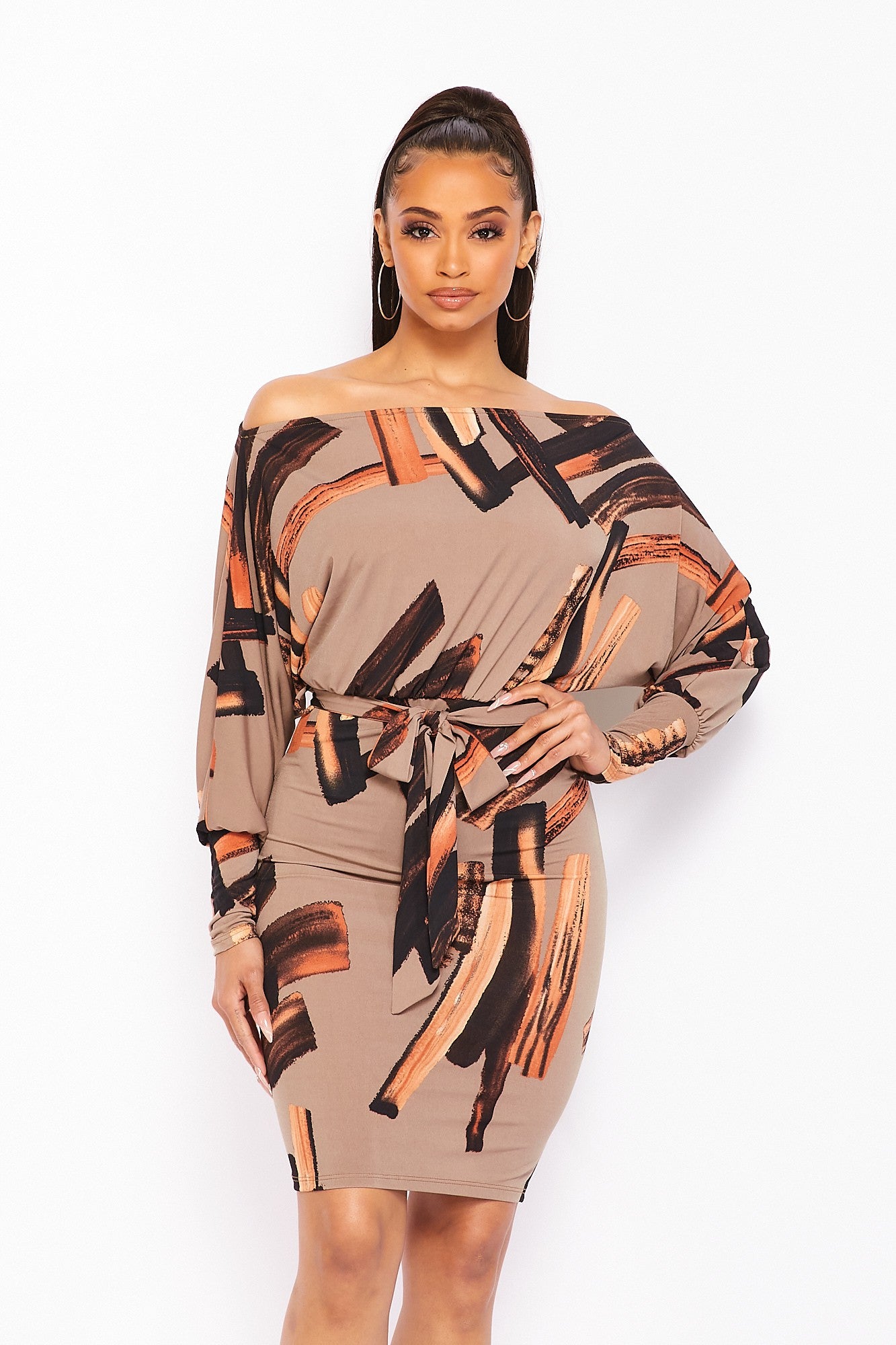 Off shoulder mini dress with self waist tie -Cottony hand with great stretch -True to size -Model is 5' 7" and wearing size S