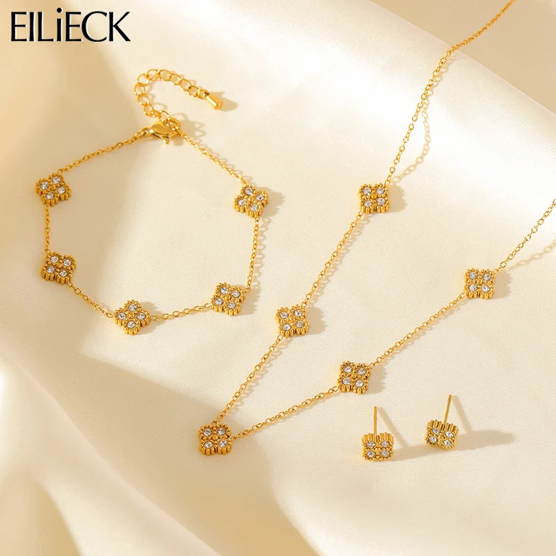 EILIECK 316L Stainless Steel Leaf Clover Zircon Necklace Earrings Bracelet Set For Women New Fashion Waterproof Jewellery Gift