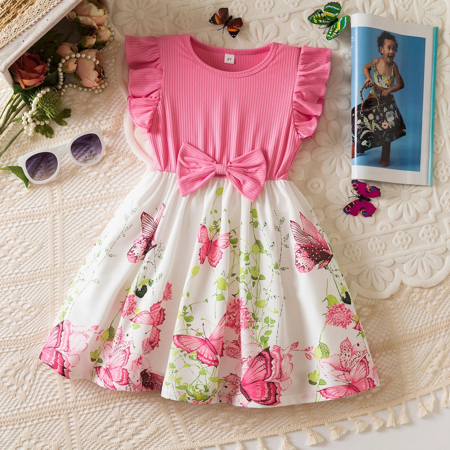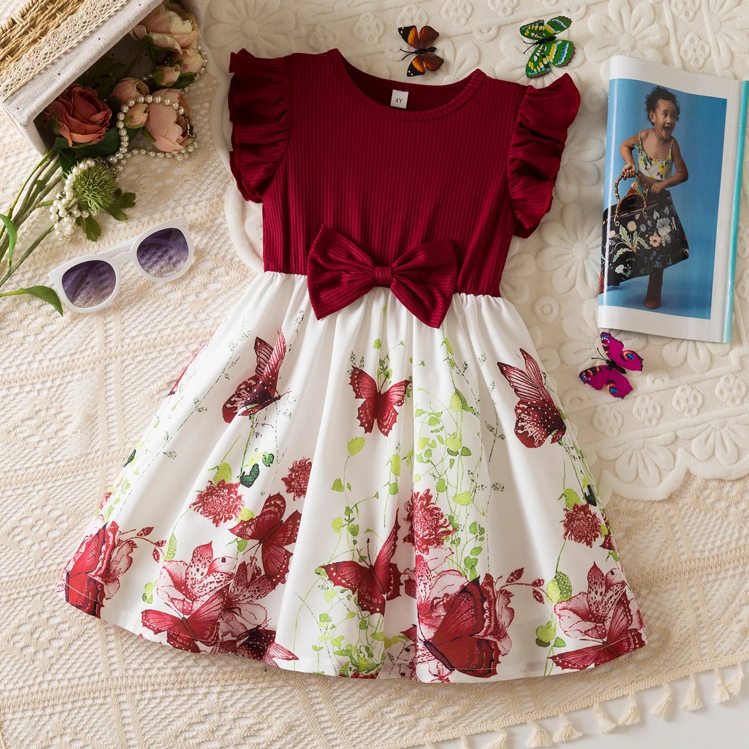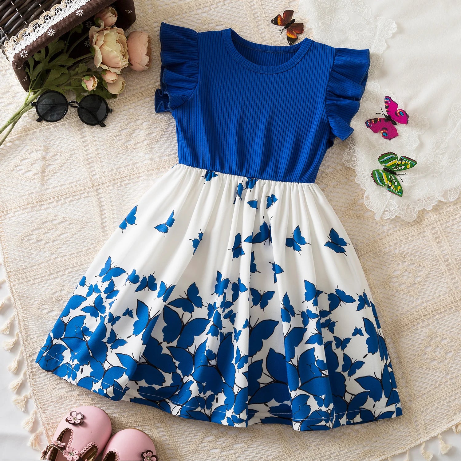 Girls Butterfly Print Princess Dress Kids Summer Ruffles Sleeve Elegant Party Clothes Children 3-8 Years Wedding Casual Dress