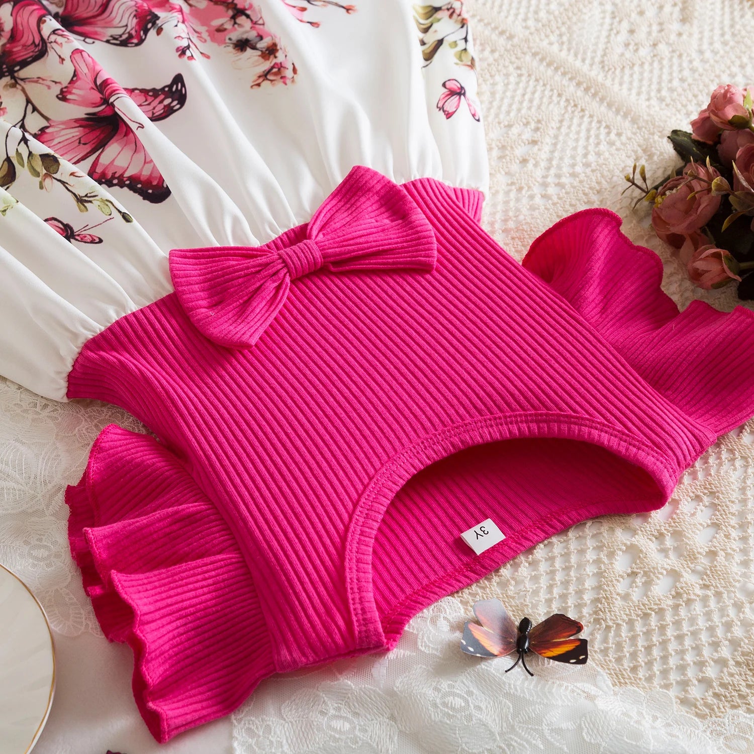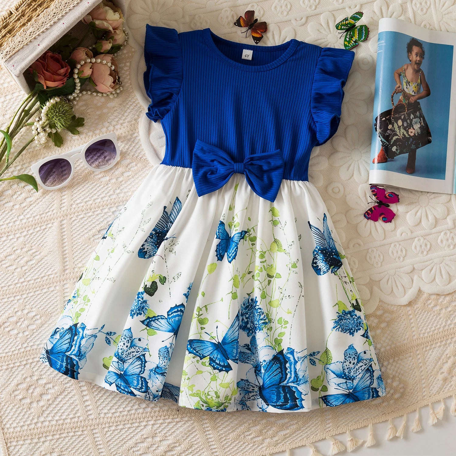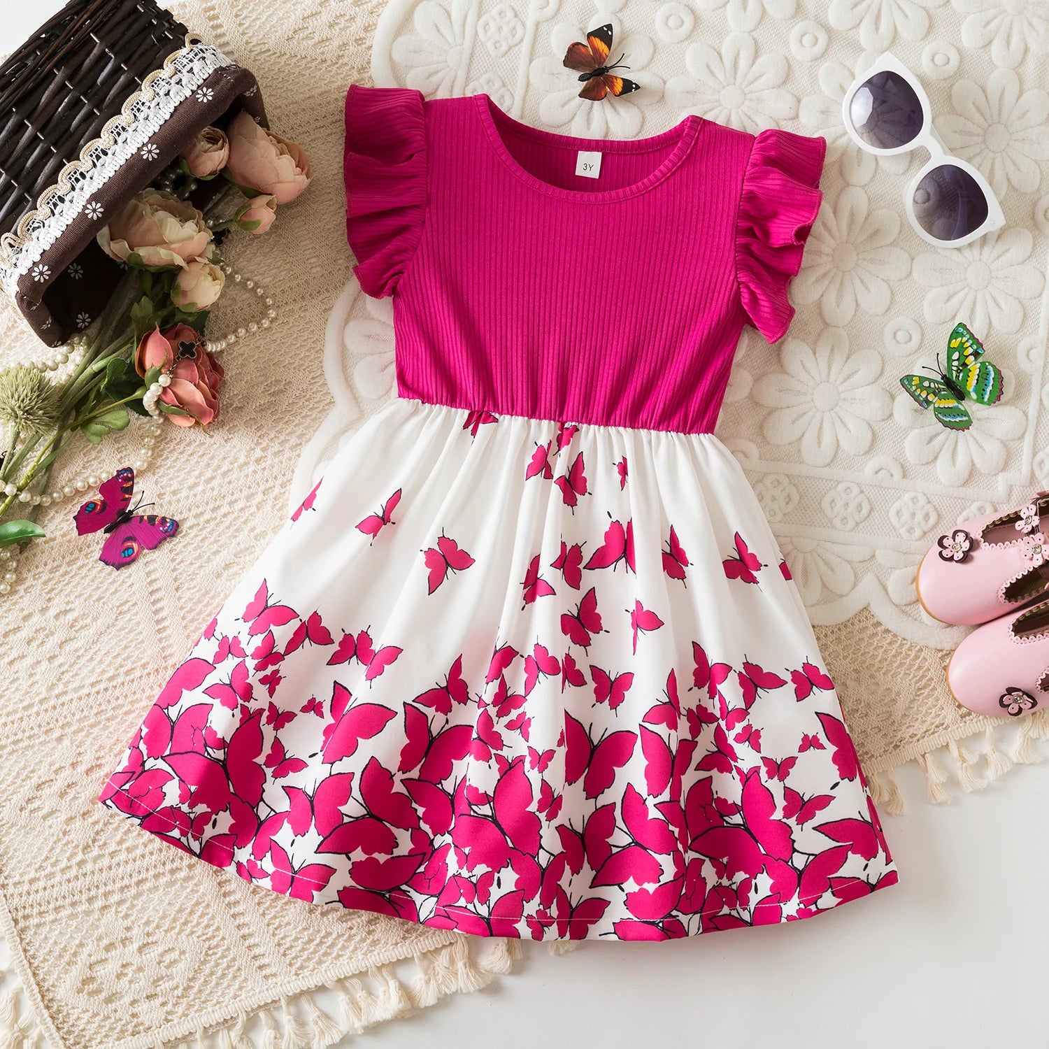 Girls Butterfly Print Princess Dress Kids Summer Ruffles Sleeve Elegant Party Clothes Children 3-8 Years Wedding Casual Dress