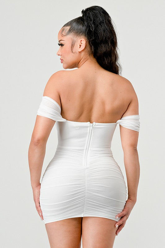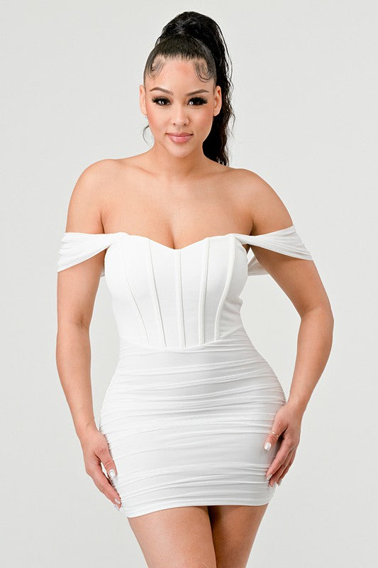 LUXE DRAPED OFF SHOULDER CORSET MINI DRESS