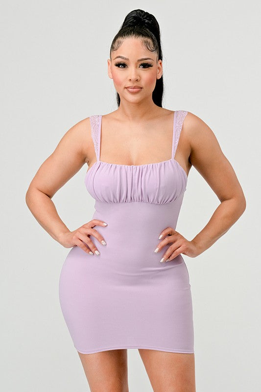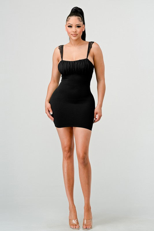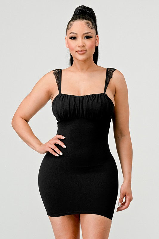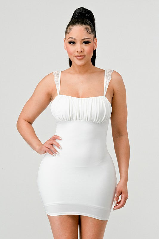 LUXE RUCHED SWEETHEART LACE STRAPS MINI DRESS