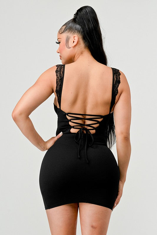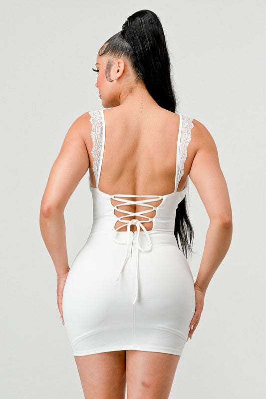 LUXE RUCHED SWEETHEART DRAWSTRING LACE UP BACK LACE STRAPS BODYCON MINI DRESS SELF:95%POLYESTER,5%SPANDEX LINING:100% POLYESTER | IMPORTED MODEL IS 5'8" AND IS WEARING A SMALL