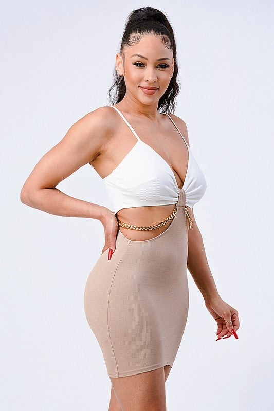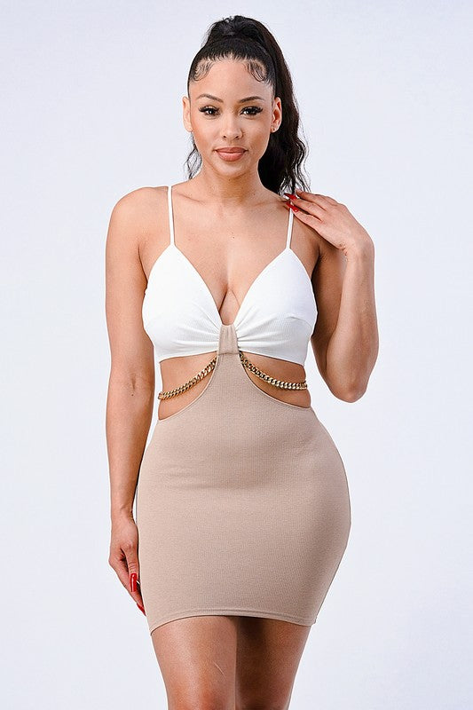 MULTI FABRIC BRALETTE SIDE CUTOUT WITH GOLD CHAIN ZIPPER CLOSURE BACK BODYCON MINI DRESS SELF:95%POLYESTER 5%SPANDEX LINING:100%POLYESTER | IMPORTED MODEL IS 5'8" AND IS WEARING A SMALL
