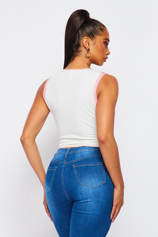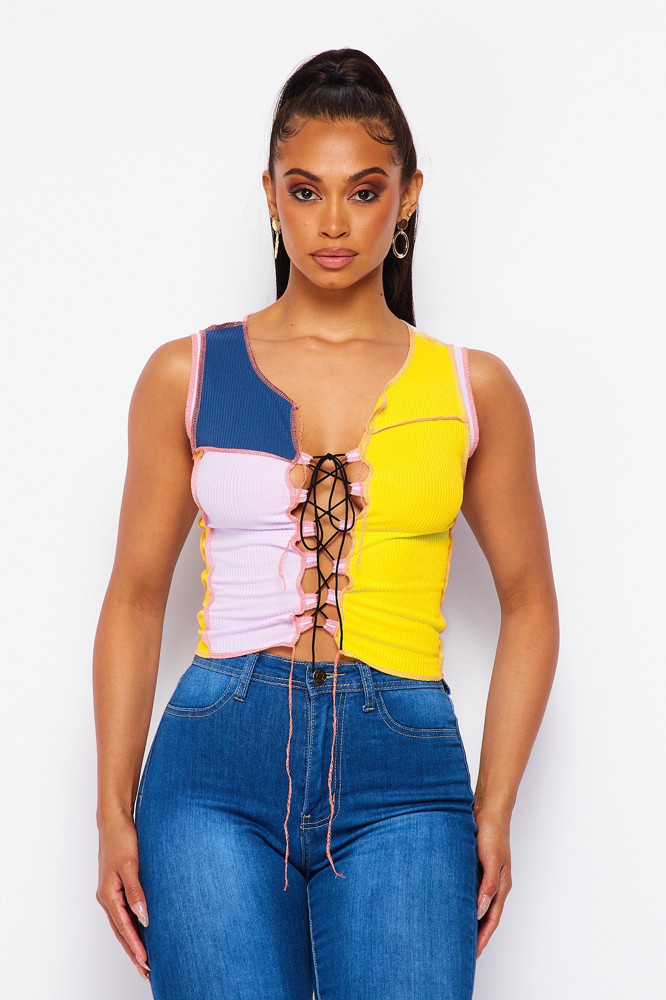 TOP FEATURES FRONT LACE DETAIL SLEEVELESS MULTICOLOR