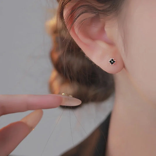 S925 Sterling Silver Chic Clover Black Zircon Flower Plant Stud Earrings for Women Fine Jewelry High Luxury Vintage Accessories